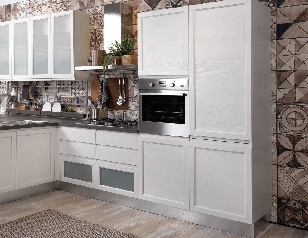 Este modelo se caracteriza por una puerta con marco de 22 mm, un diseño limpio y contemporáneo y unos acabados en laca de fresno de poro abierto en delicados colores. El concepto tradicional de puerta con marco se reinterpreta y actualiza en Selma, con un tirador especial creado a partir del perfil del travesaño superior.