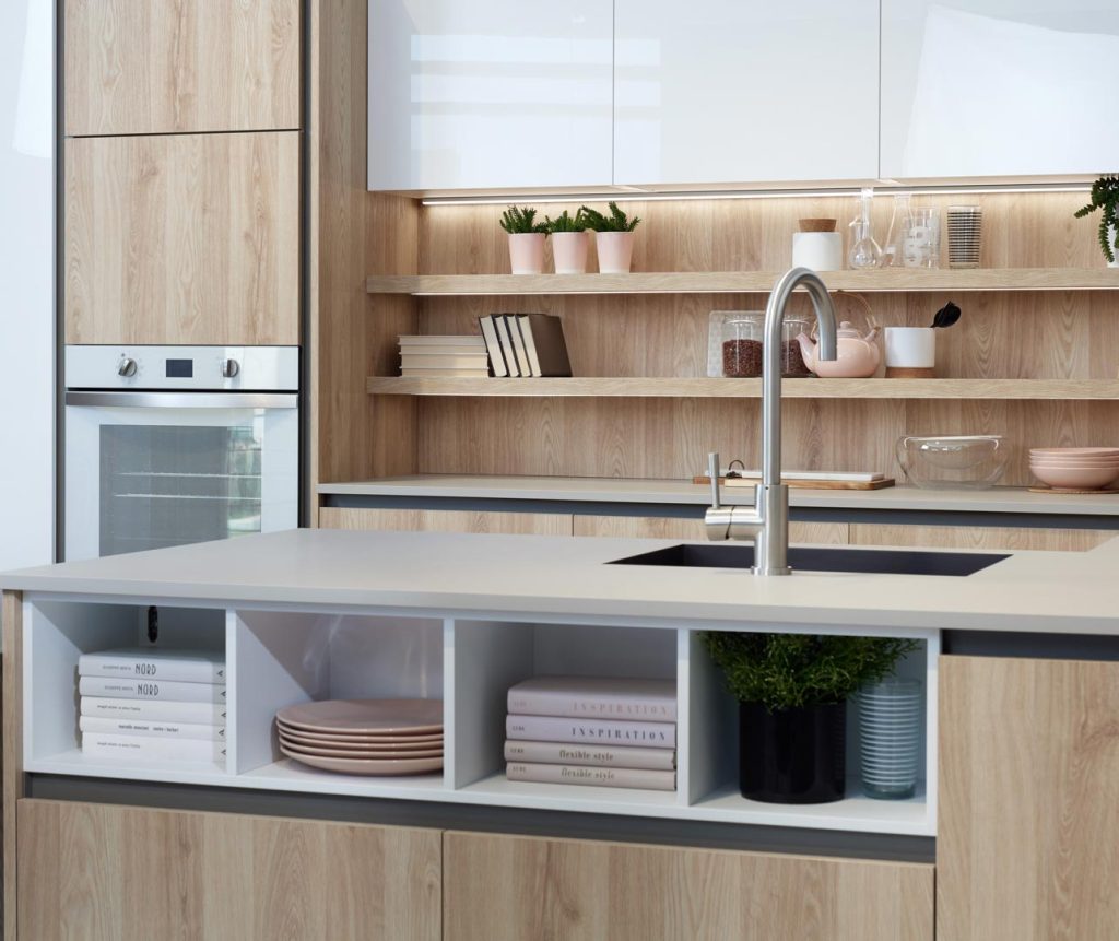 La colección Wood presenta seis nuevos acabados de madera en tonos cálidos, inspirados en la naturaleza, que aportan calidez y autenticidad a la cocina: roble natural, roble blanco, roble gris, roble moscatel, roble ahumado y roble negro.